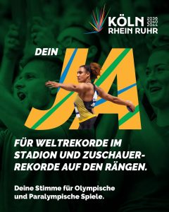 Köln und die Region RheinRuhr wollen sich um die Austragung der Olympischen und Paralympischen Spiele bewerben – doch ob die Bewerbung stattfindet, darüber dürfen bis zum 19. April 4 Millionen Wahlberechtigte in 14 Städten abstimmen. Wir als Kölner Leichtathletikverein unterstützen die Bewerbung – denn Olympische Spiele vor der eigenen Hautür wären ein Meilenstein für den Kölner Sport. Und eine Chance für nachhaltige Spiele: KölnRheinRuhr hat, was es braucht: herausragende Sportstätten in großer Vielfalt. Deshalb könnte Olympia und Paralympics mit 100 % bestehenden oder temporären Sportstätten umgesetzt werden. Für den Sport-Standort Köln und somit auch für uns und unsere Athletinnen und Athleten wären Heim-Spiele eine „Once in a lifetime“-Erfahrung und eine wertvolle Chance, denn: Die Bewerbung löst jetzt bereits Investitionen aus. Zusätzliche Landesmittel und 600 Millionen Euro aus dem Sondervermögen bringen einen Modernisierungsschub für Sportstätten. Davon profitieren Vereine, Kommunen, Athletinnen und Athleten langfristig – also auch wir. Noch bis zum 19. April könnt ihr abstimmen – damit die Spiele vielleicht eines Tages wirklich nach Köln kommen!